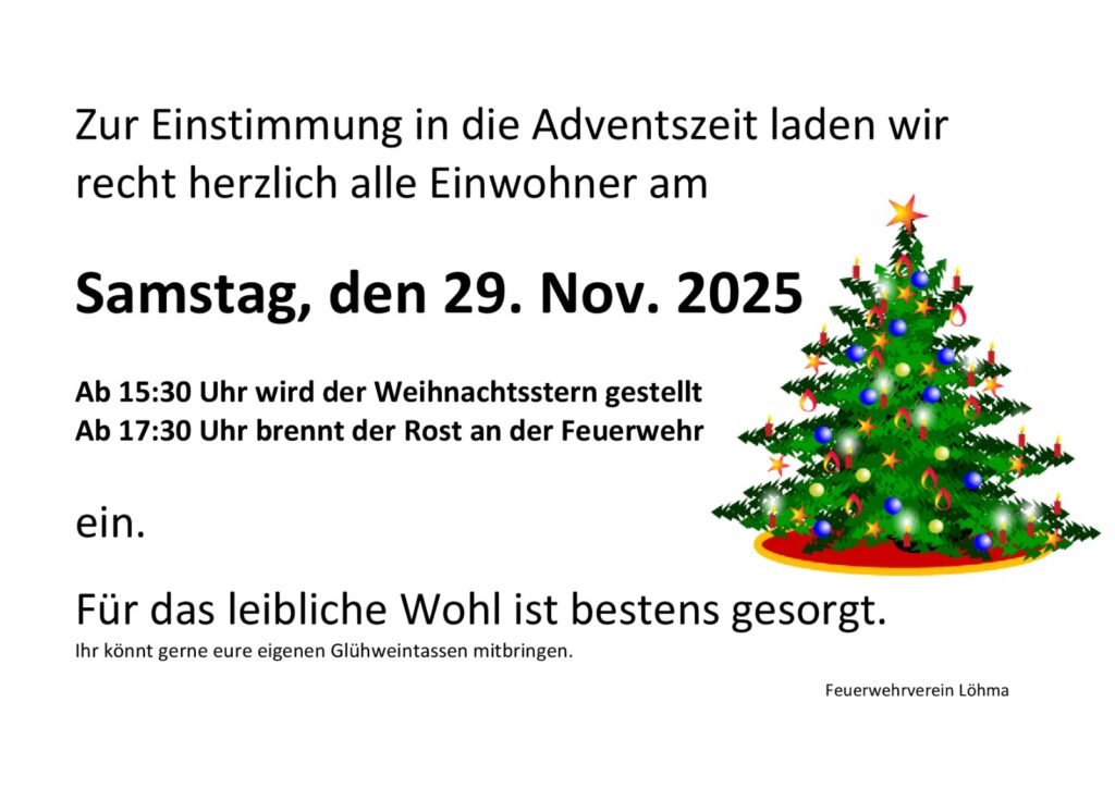 Zur Einstimmung in die Adventszeit lädt der Feuerwehrverein Löhma recht herzlich alle Einwohnerinnen und Einwohner an die Feuerwehr ein. Ab 17:30 Uhr brennt der Rost und es zieht, vielleicht ein letztes Mal in 2025, thüringischer Rosterduft durch Löhmas Straßen. Bei leiblichen Wohl soll das Setzen des Adventssterns gefeiert werden.